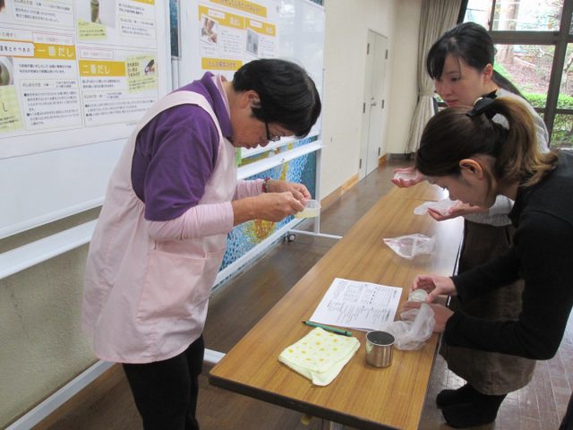 全員そろったところで味覚のお話し、だしの取り方、適塩についての話しと、3種類のだしの飲み比べを体験。3種類のだしの飲み比べ本物の味はわかりましたか?