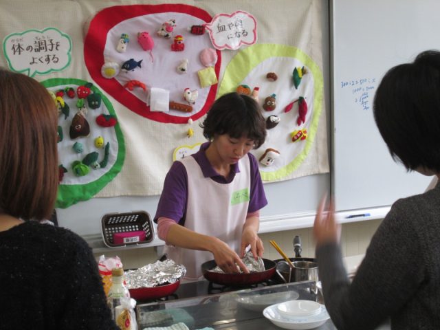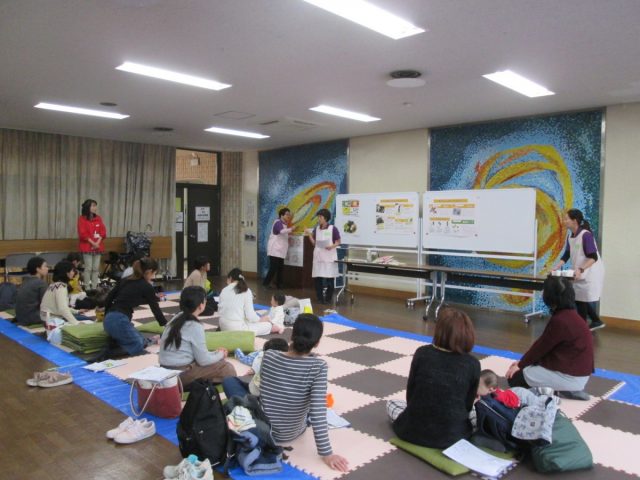 その後は月齢で2グループに分かれて月齢に合わせたお話しやお悩み相談のグループと調理実習室にて離乳食の取り分けの実演と試食を体験してもらいました。