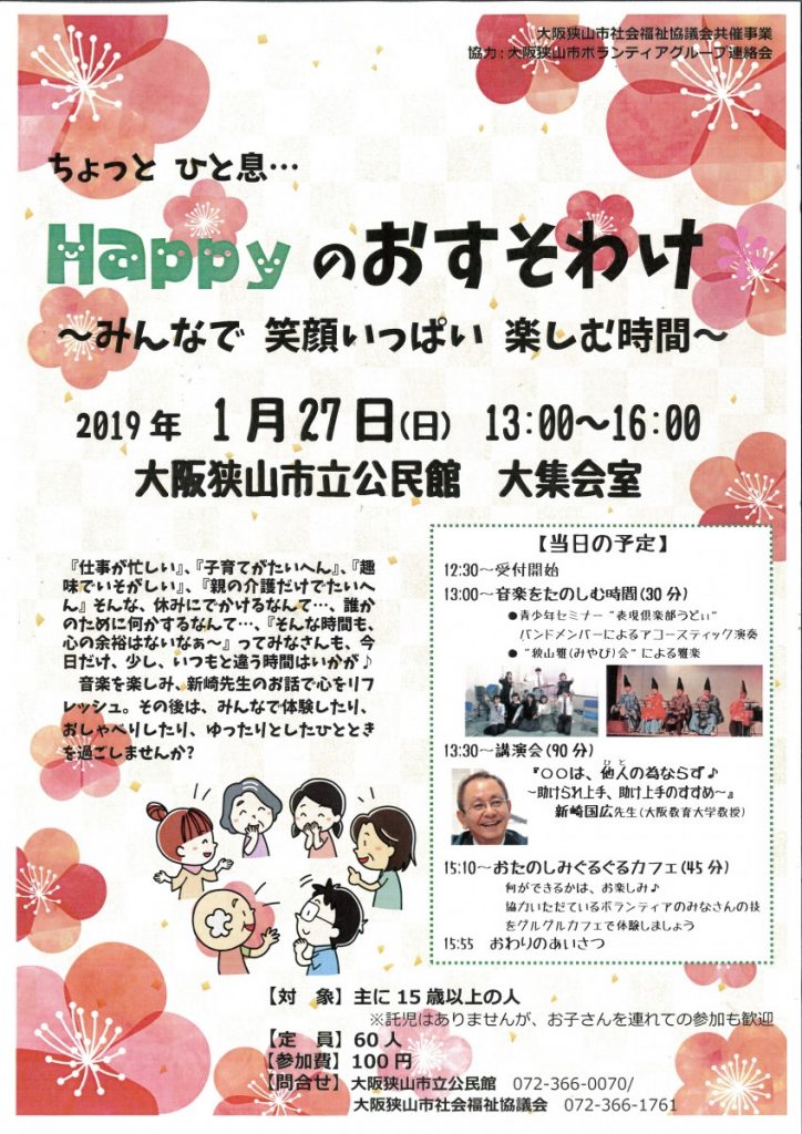 今回、公民館だけではできない事業を、大阪狭山市社会福祉協議会と一緒にさせて頂いたおかげで実現することができ、Happyを頂きました。