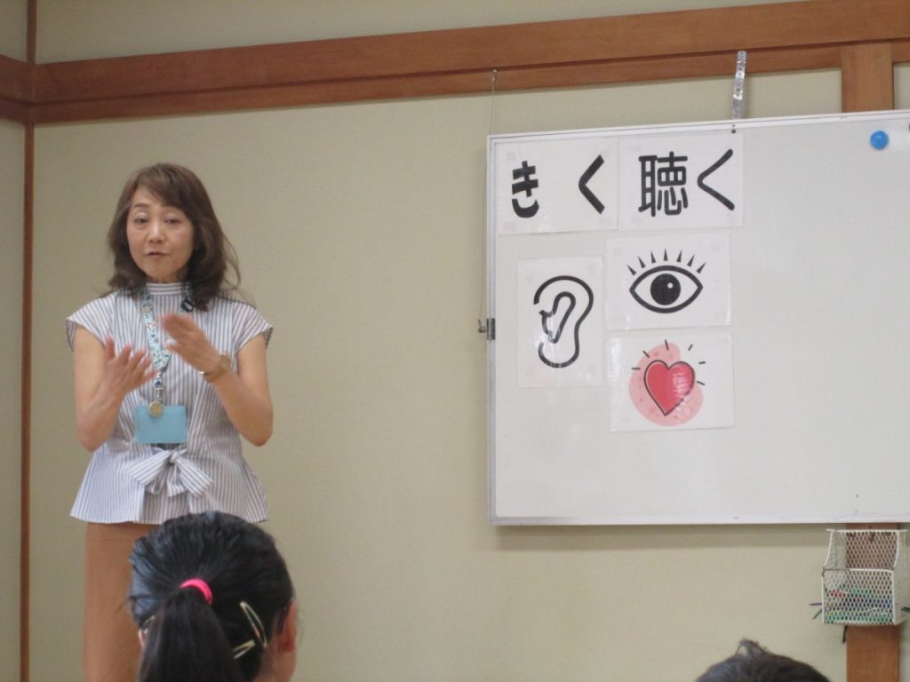 ひとを大切にする”きく(聴く)”、 『目・耳・ハートは”きく”合図』を今日は大事に過ごしてねというお話を聴いてスタート。