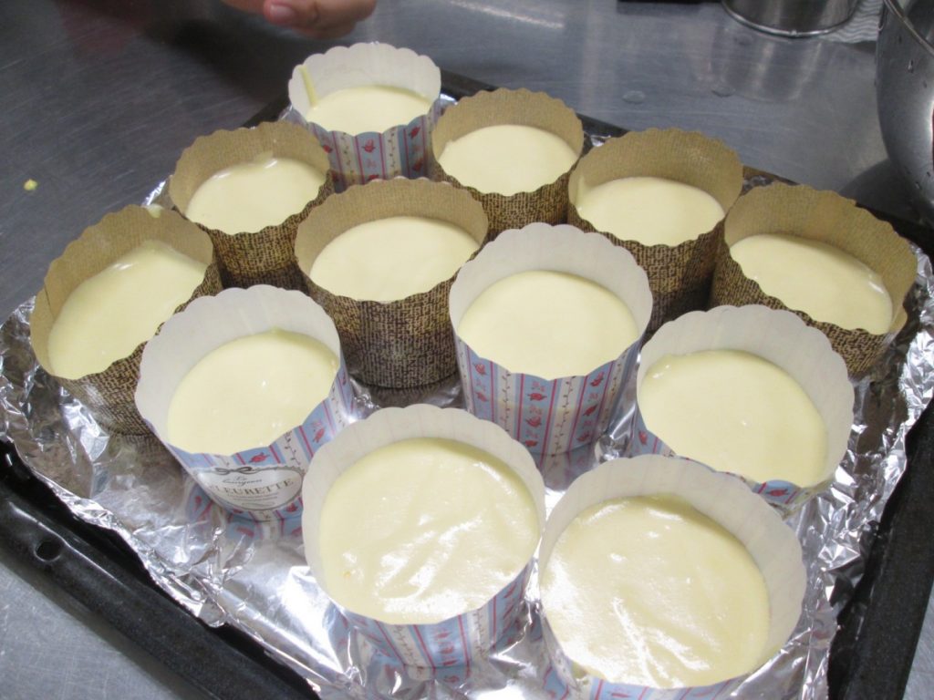 事前にレシピを調べてみて、予算と焼き時間の都合上、今回は、マフィン型で作るスフレチーズケーキを作りました![]()