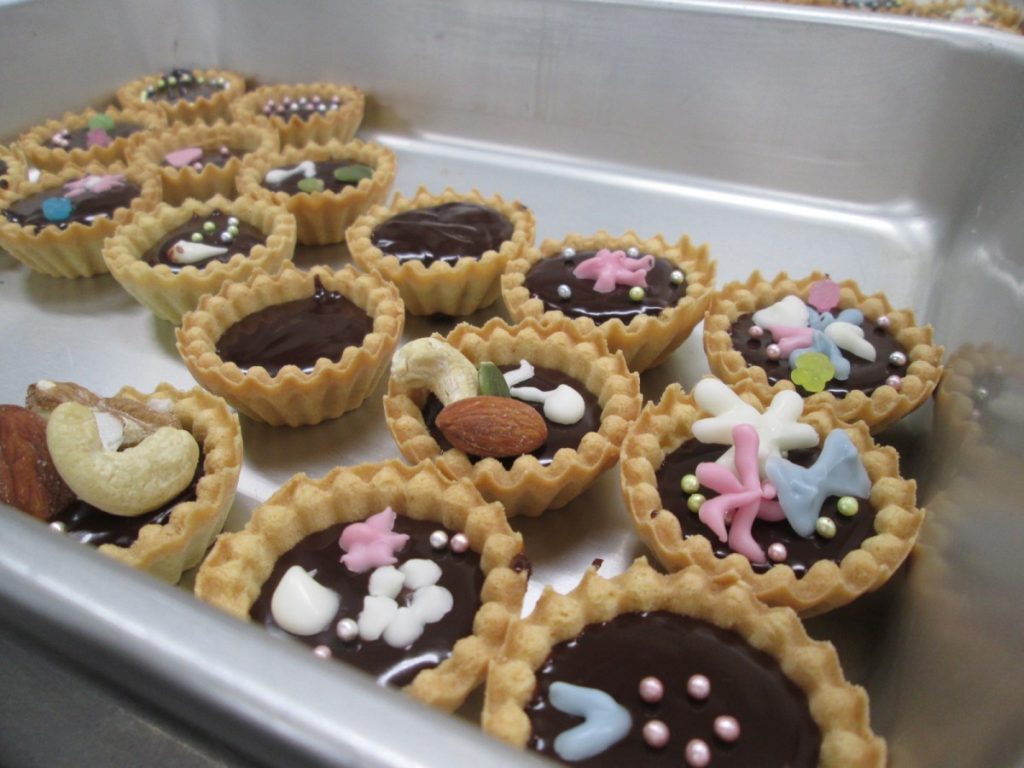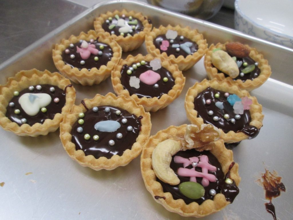 タルト生地から作っていると時間が足りなくなるので、丁度バレンタイン向けの材料が出始めていたので、ミニタルトカップを購入して、生チョコづくりから始めトッピングを楽しみました。