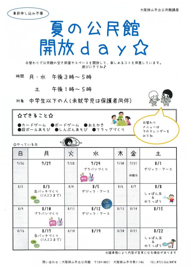 日替わりで公民館の空き部屋やスペースを開放して、楽しめることを用意しています♬事前申し込みは不要なので、毎回、何人くらいの人が来てくれるのか、ドキドキですが…。今のところ、密にならない程度の人数が、途切れることなく、来館してくれています♬