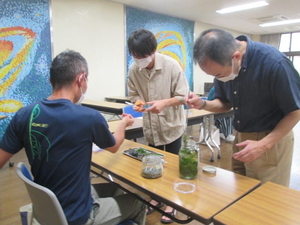 今回、その瓶を再度持参してもらってのスタートでしたが、みなさん同じように育っているかと思いきや、うまく育たなかった人、芝生のように短い水草が育っている人、水草の丈が何センチも伸びている人、何故か違う種類の水草が育った人など、三者三様といった状況でした![]()