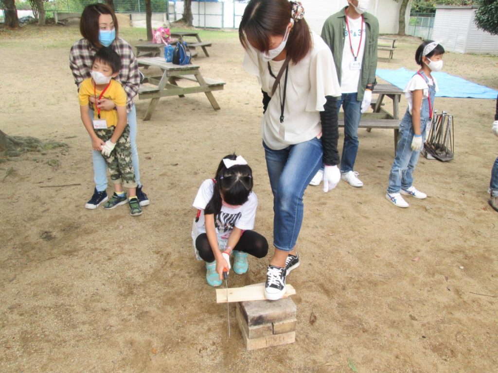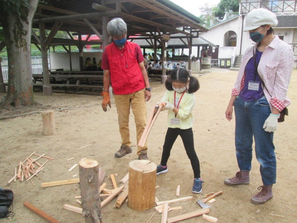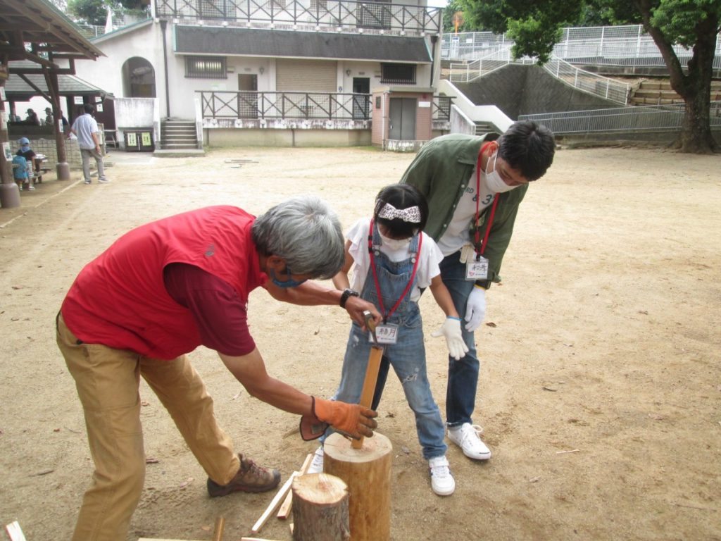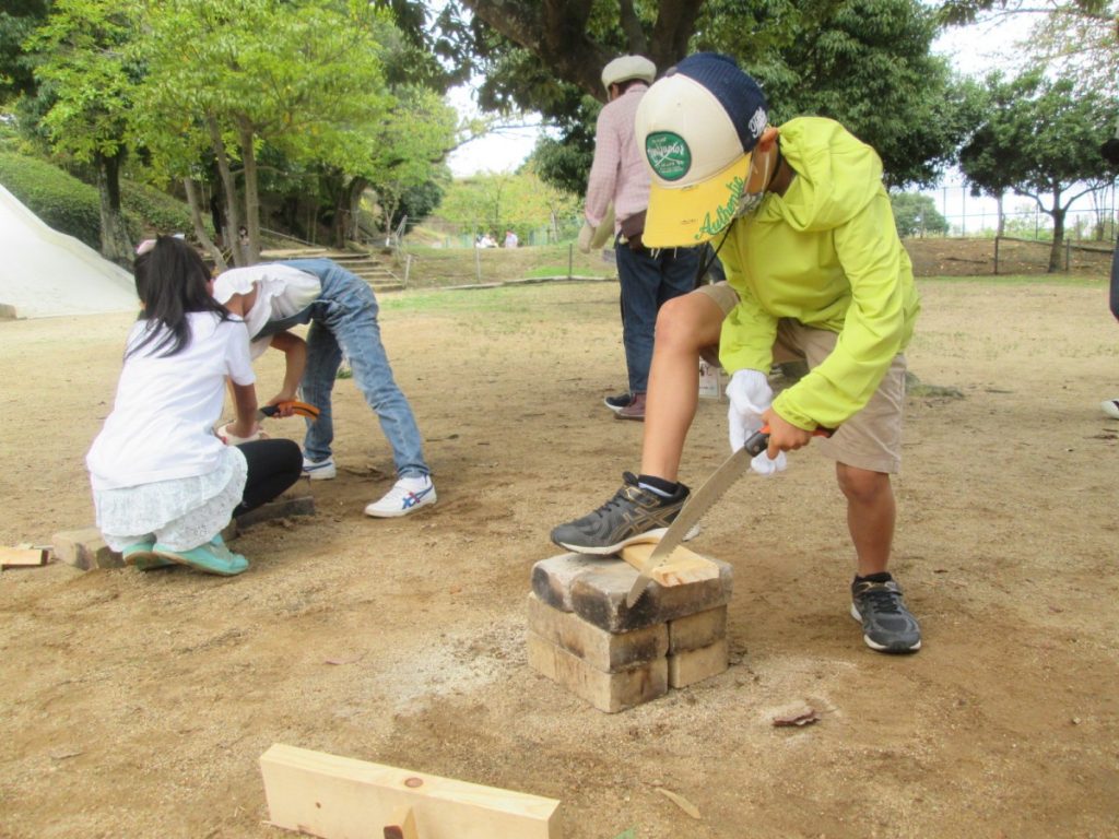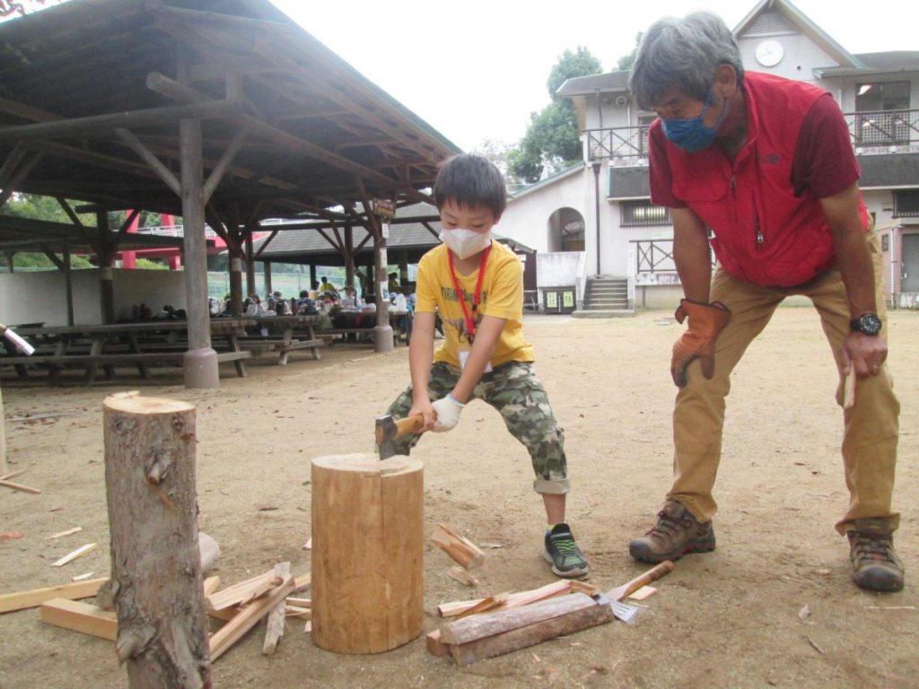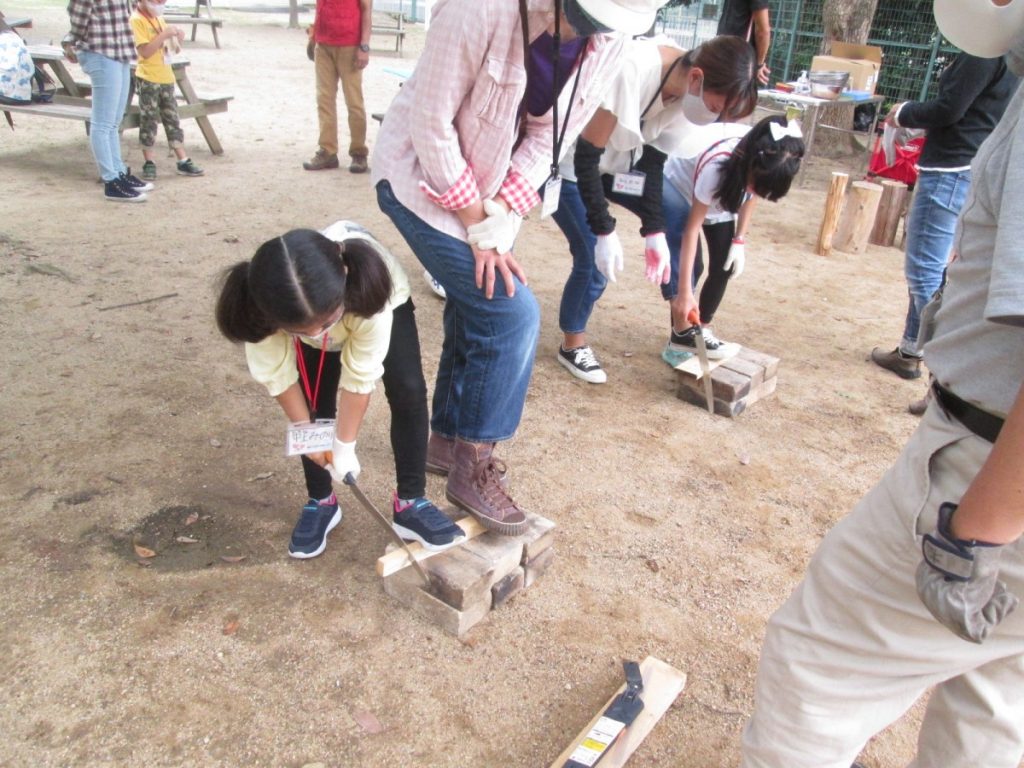 火を起こすために必要な、薪づくり。斧・のこぎりと言った日ごろあまり使ったことのない道具を正しい使い方を教わり、チャレンジ。