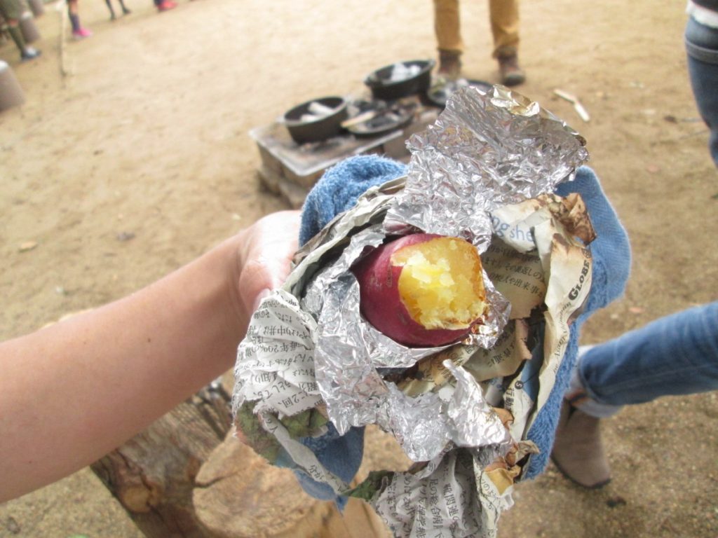 お芋を洗って、アルミホイルと濡れた新聞紙を巻いて、ダッチオーブンへ。