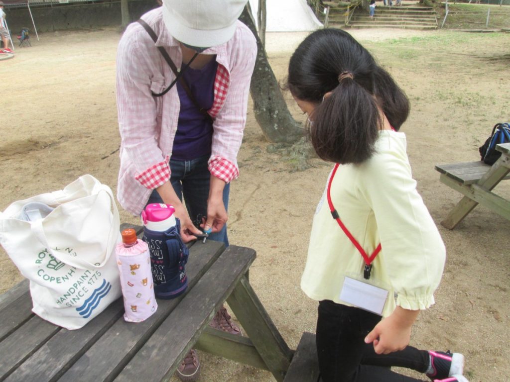 薪ができた後は、火おこし体験。ファイヤースターターを使って小さな火をつけ、自分の手でパンと消すことをやってみました。