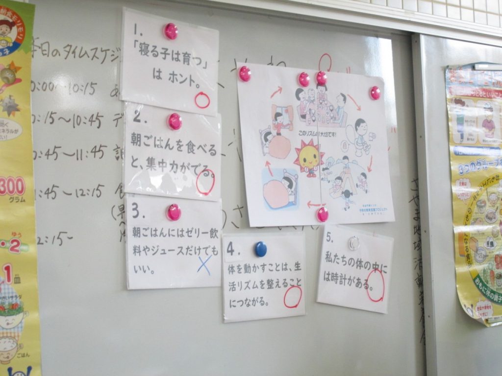 試食の後は、”早寝・早起き・朝ごはん”のお話や飲み物の中に含まれる砂糖の量のお話を聴きました。