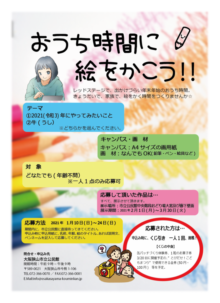 市立公民館では、年末年始のおうちで過ごす時間に、みなさんが描いてくださった絵を募集します。
