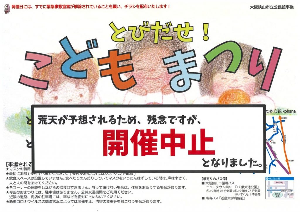 3月21日㈰ 午前11時~午後2時、東大池公園での開催を予定しておりました『とびだせ!こどもまつり』は荒天が予想される為、残念ながら、中止とさせて頂くこととなりました。