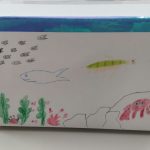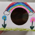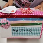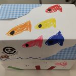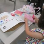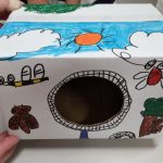 子どもたちは白いダンボールにお気に入りの絵を描きシールを貼りスタンプを押して自分だけの打楽器「カホン」を作りました。