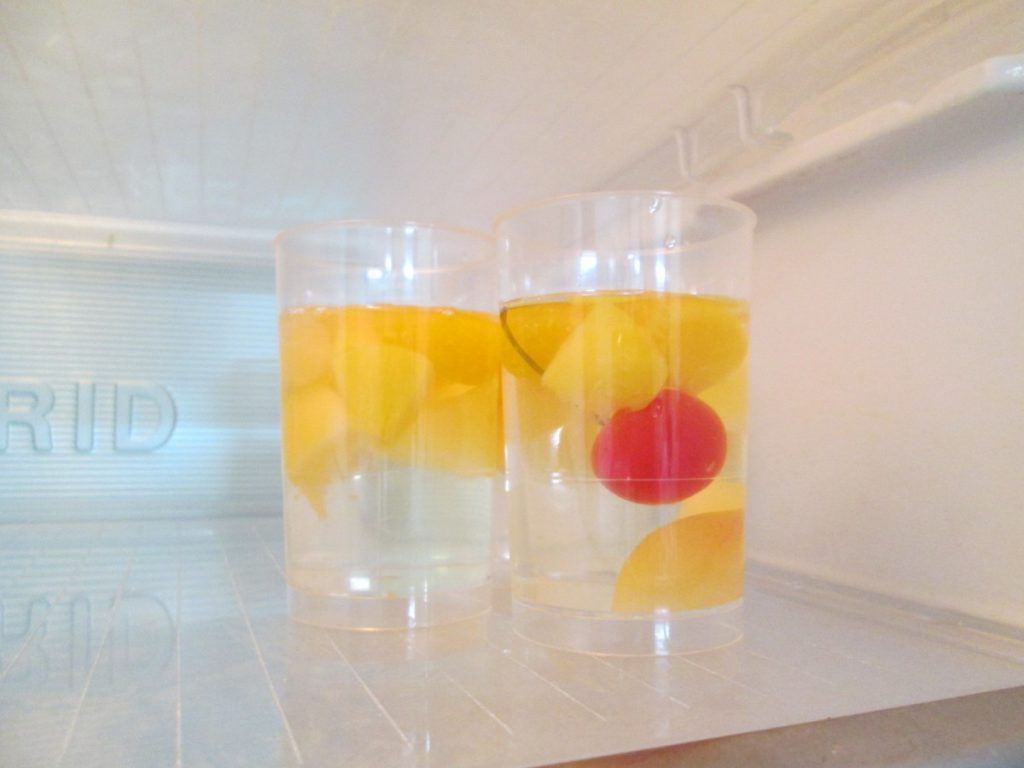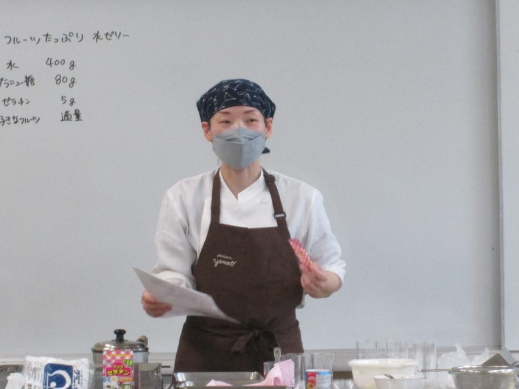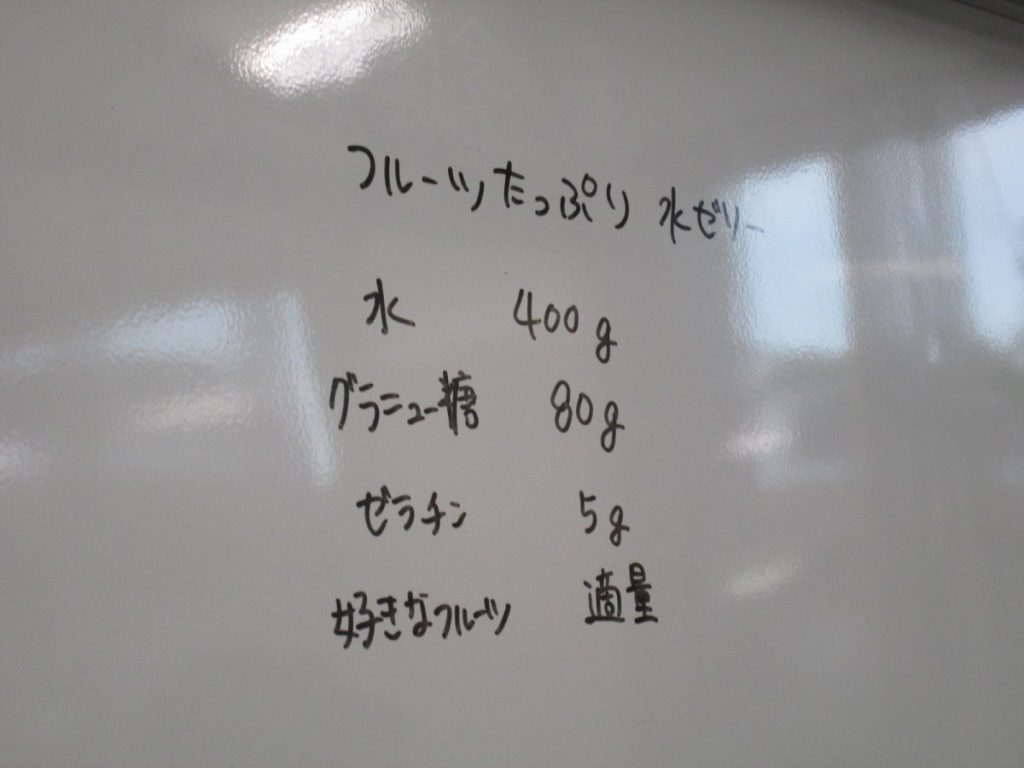 今回の参加者のアレルギーへの対応で、小麦粉、卵、牛乳を使わないスイーツメニューを考えて頂き、果物がたっぷり入った水ゼリーをつくりました。