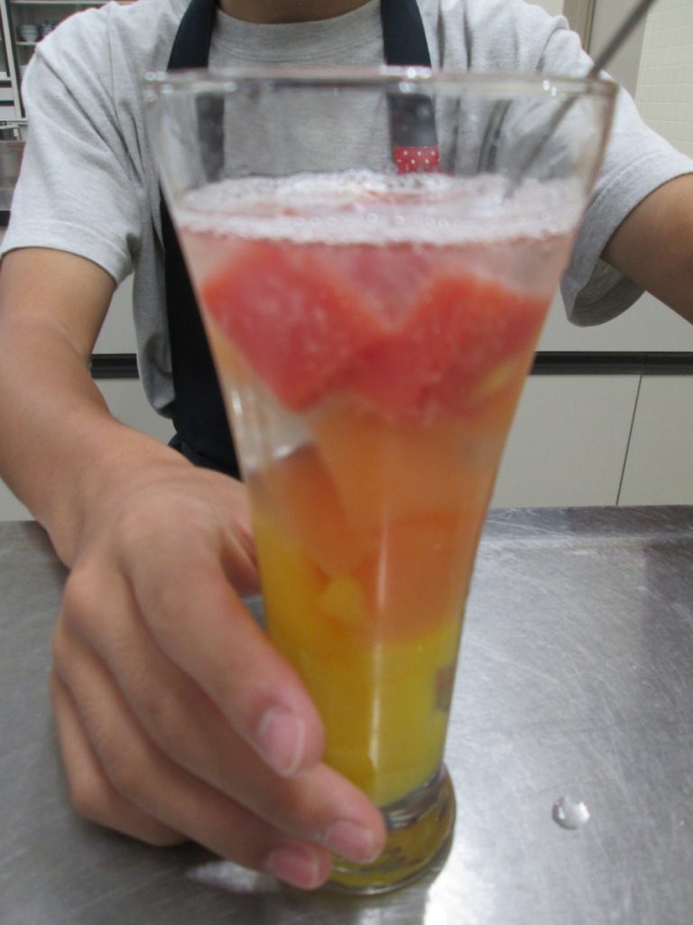 冷やして固まるまでの時間を使って、フルーツジュースを使ったゼリーのソーダ割を試食しながら、ゼラチンなどの固める材料のそれぞれの特徴などを教えてもらいました。