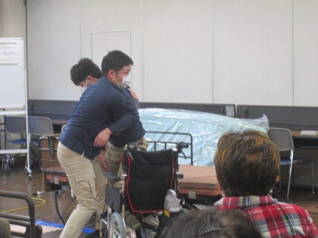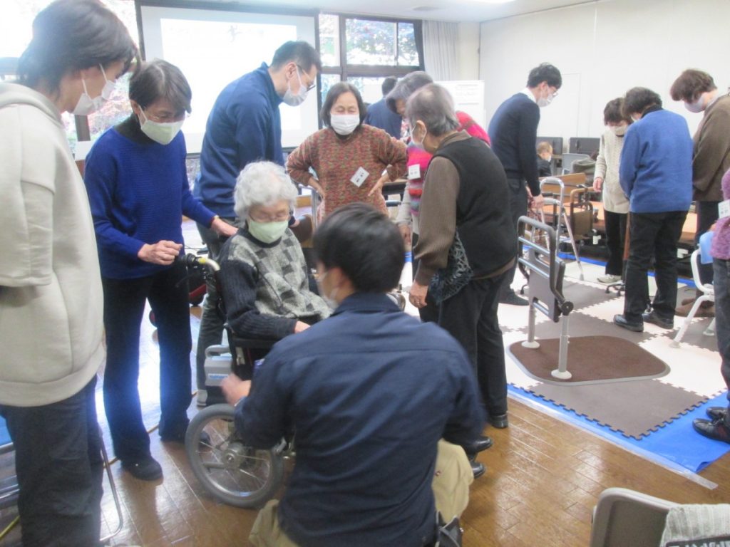 昨年同様に福祉用具のまあんさんにもご協力頂き、最新のベッドや車いす、杖やポータブルトイレ等それぞれが興味のある用品を実際に手に取って体験させていただきました。
