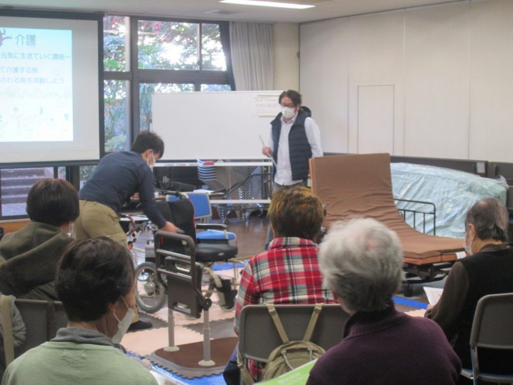どんとこい!介護2021(全6回)講座の第3回目は12月14日(火)午前10時~『実際に介護用品を使って介護する側・される側を体験しよう』を前回に引き続き、さやまの里在宅介護支援センターの安達賢治さんにお越し頂き、お話をして頂きました。