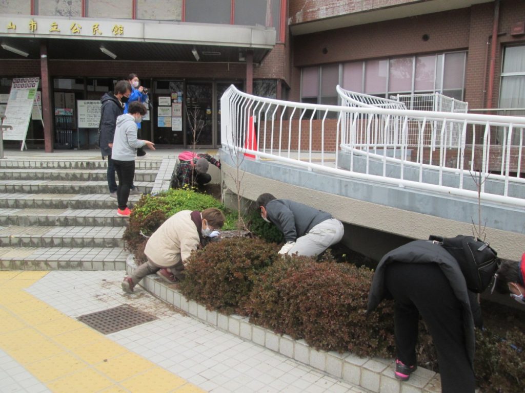 桜の木がなくなって、寂しくなっていた公民館の玄関前広場。