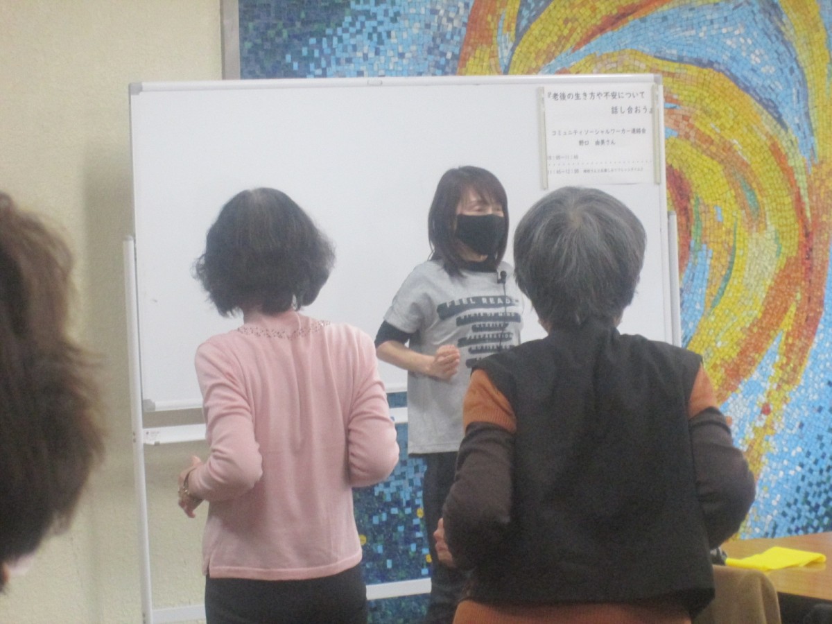 どんとこい!介護2021(全6回)講座の第6回目は3月8日(火)午前10時~「老後の生き方、不安について話しあおう」というテーマで、コミュニティソーシャルワーカー連絡会の野口由美さんにお越し頂きました。