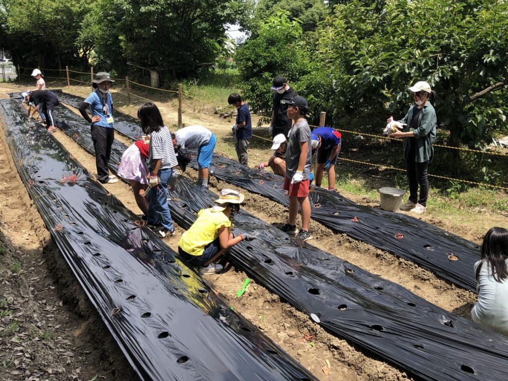 畝にマルチをはり、事前に大豆から育てておいた苗をみんなで植えました。
