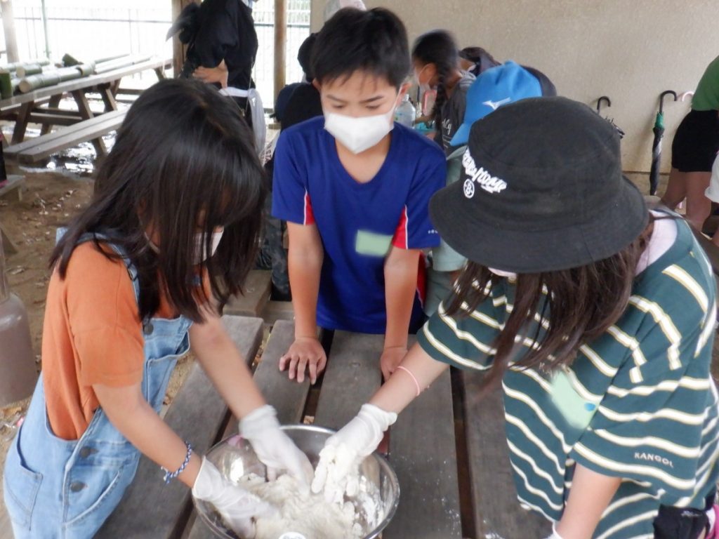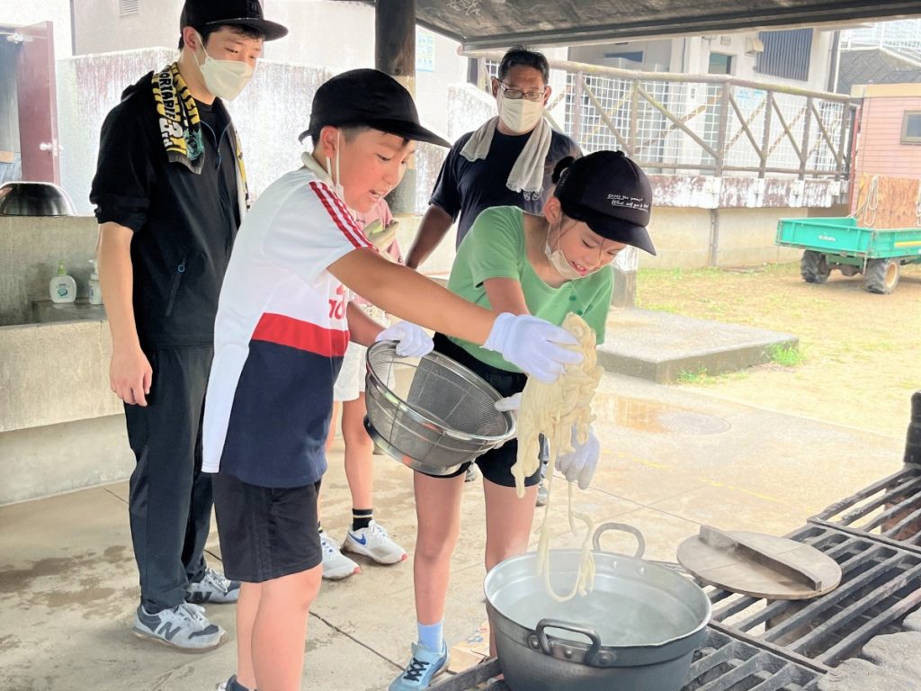 うどん作りは粉からスタートし、こねて、ふんで、伸ばして切って、大きな鍋で茹でました。子供達は、かたい!太い!でもおいしい!と笑いながら食べてくれました。