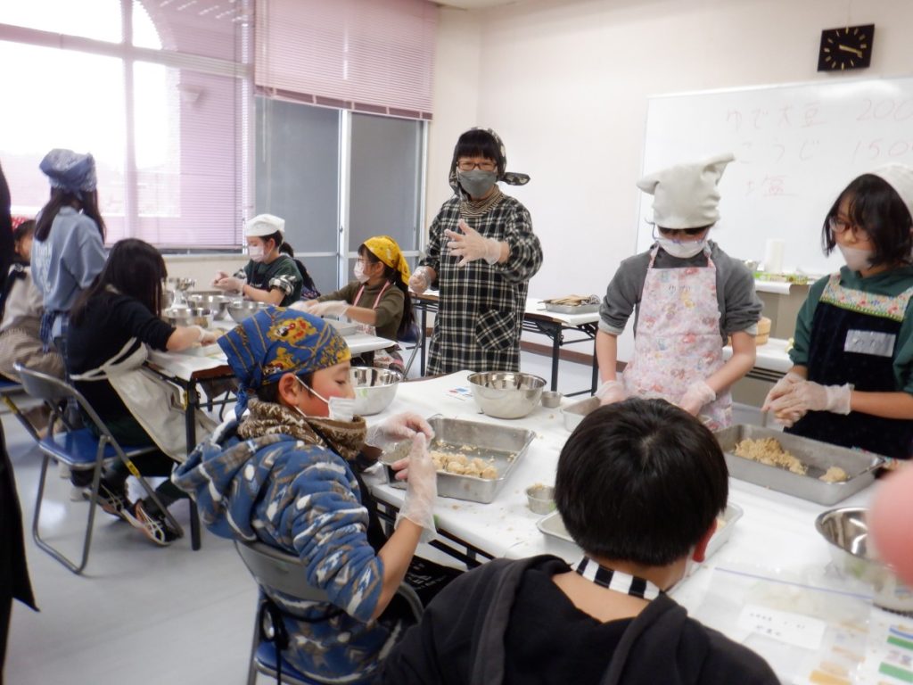 今回は、市立公民館に集まって、味噌づくりをしました。