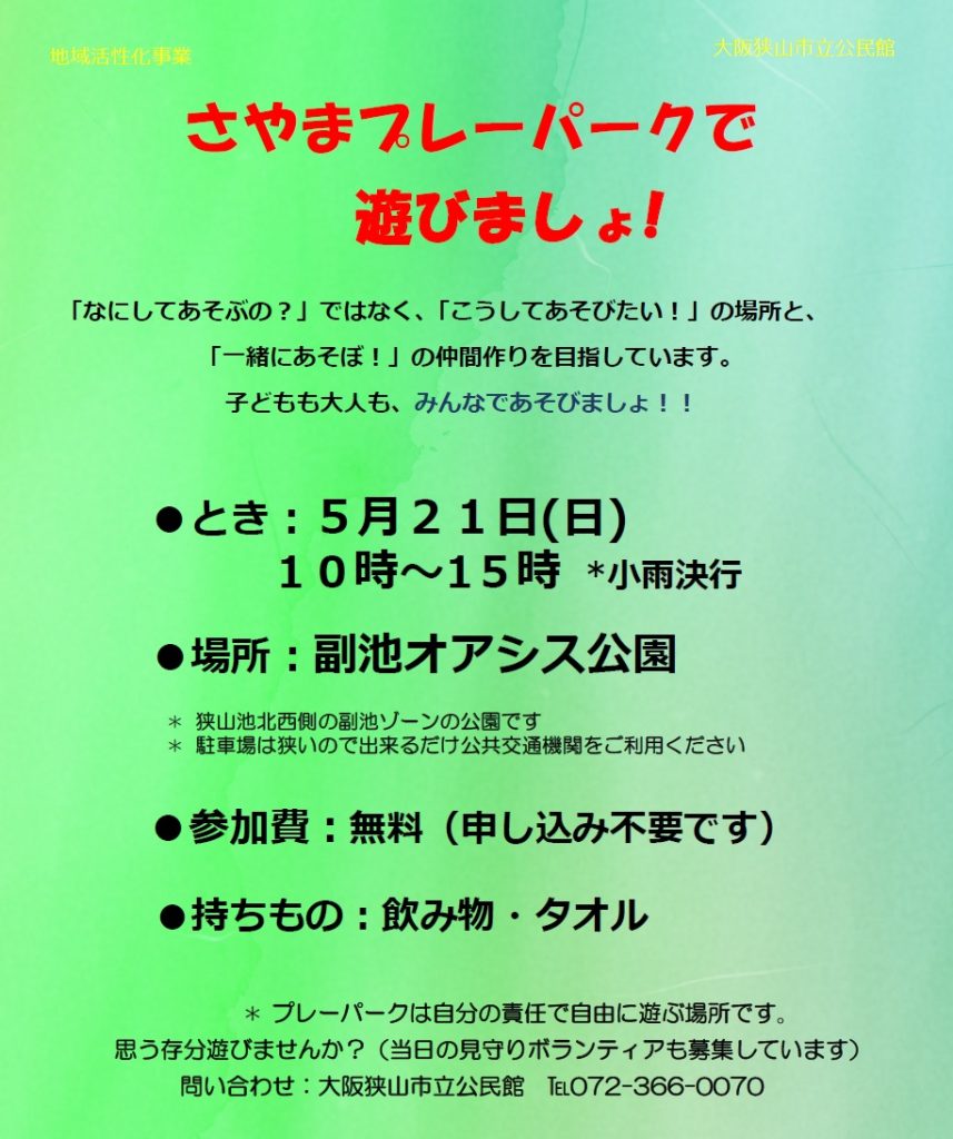 副池オアシス公園で開催します。緑いっぱいの中で、大人も子どもも思う存分遊びましょう!!
