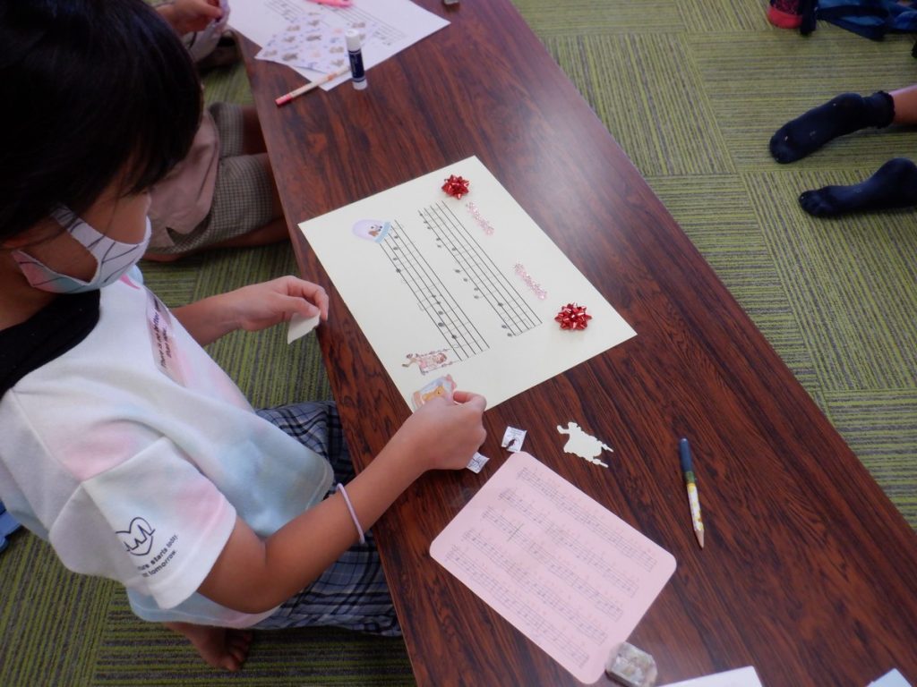 後半は「HAPPY BIRTHDAY TO YOU」の楽譜を画用紙に書き、キラキラシールでデコレーションしました♡みんなとてもかわいい楽譜が出来上がりました(o^―^o)
