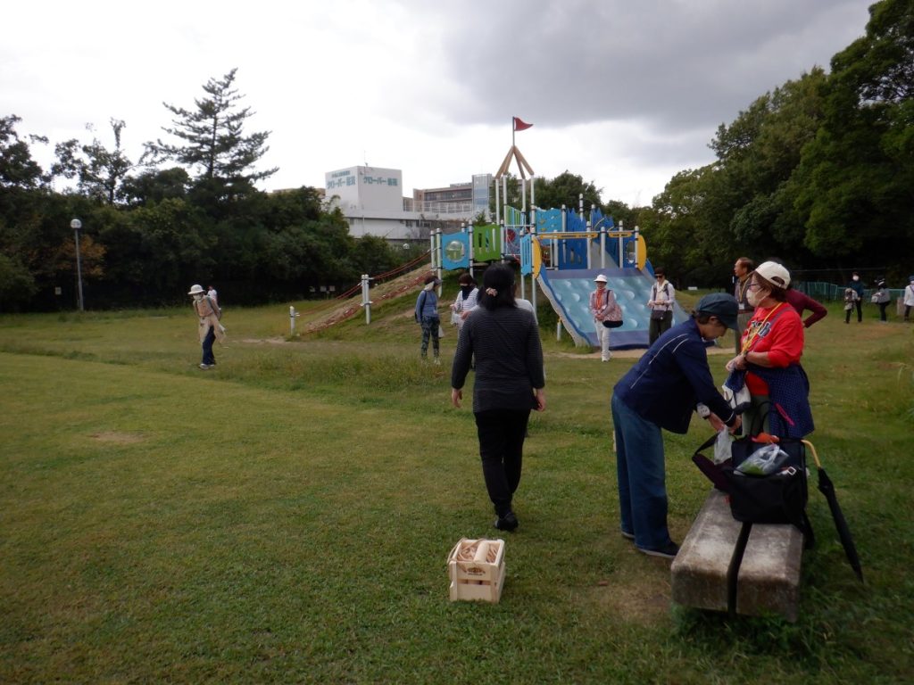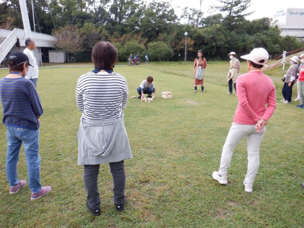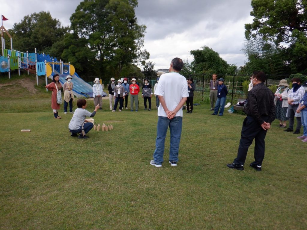自然工作に使う自然物を探しながら、新しくできた公園エリアまで足をのばし、芝生の広場で2チームに分かれて、モルック体験をしました。