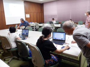 この公民館では毎年HTMLの講座をしています。webで公開する手段としては、昔はテキストエディタで書いてたのですが、最近は殆ど無いと思います。この公民館のサイトも、少し前まで、テキストエディタやDreamweaverで作っていました。今はCMS(Contents Management System)として、WordPressを使っていますが、細かな所は、やはりHTMLでソースを編集する方が早いので、HTMLの知識があると多くの場面で使う事が出来ます。まあ、レンタルサーバーだと、比較的簡単にCMS構築出来る様になっている所がほとんどですが、自分で構築するとなると、webサーバー以外に、データベースとPHPからインストールしないといけないので、結構面倒です。公民館はレンタルサーバーですが、個人的に動的ページをホストする場合は、PerlでCGIでもいいか、となるのですが、文章を他の人にも書いてもらうとなると、CMSは便利ですね。まあ、そんな一昔前の作法ですが、今年は5人の申込者がありました。いつも通り、下の写真が、今年の講座風景です。