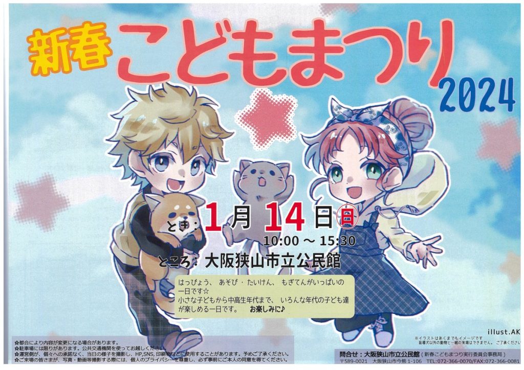 年明け、1月14日は、『新春こどもまつり2024』を催す予定です。子どもたちが楽しく、いろいろな遊びや体験ができる1日です。家族で、友達同士で、ぜひ遊びにお立ち寄りください。