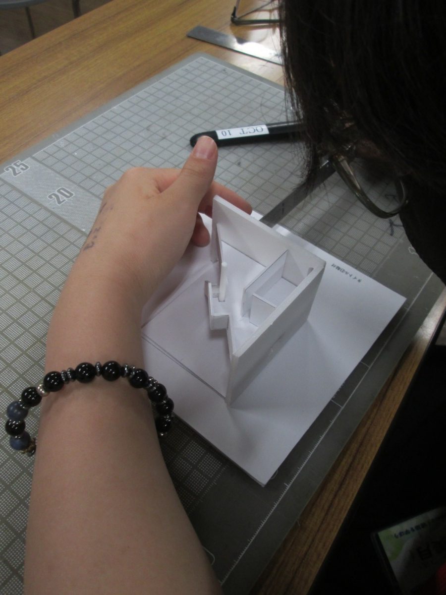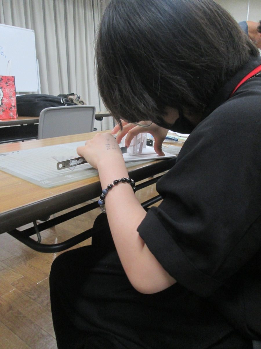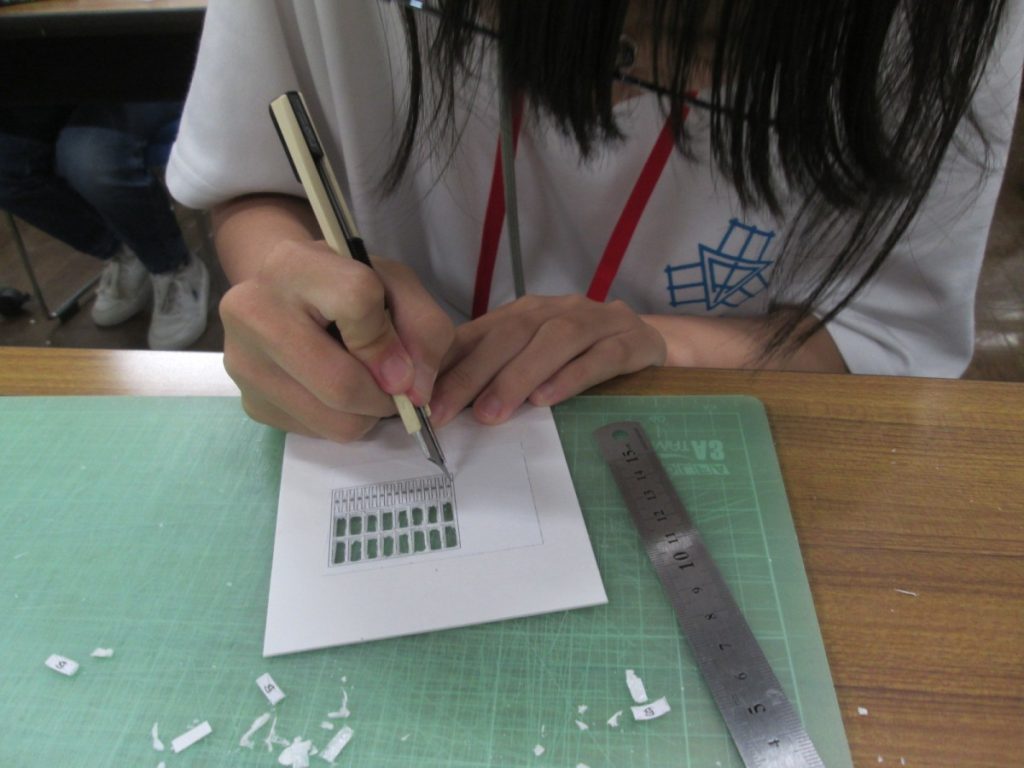 レベル①の今回は、建築というお仕事の魅力のお話を最初に聴かせて頂き、そして、模型作りに入る前に、カッターの使い方を教わり、練習しました。
