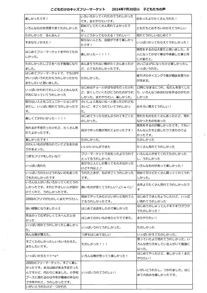 お店をしていた人、買い物に来てくれた人、いろんな人の感想です。