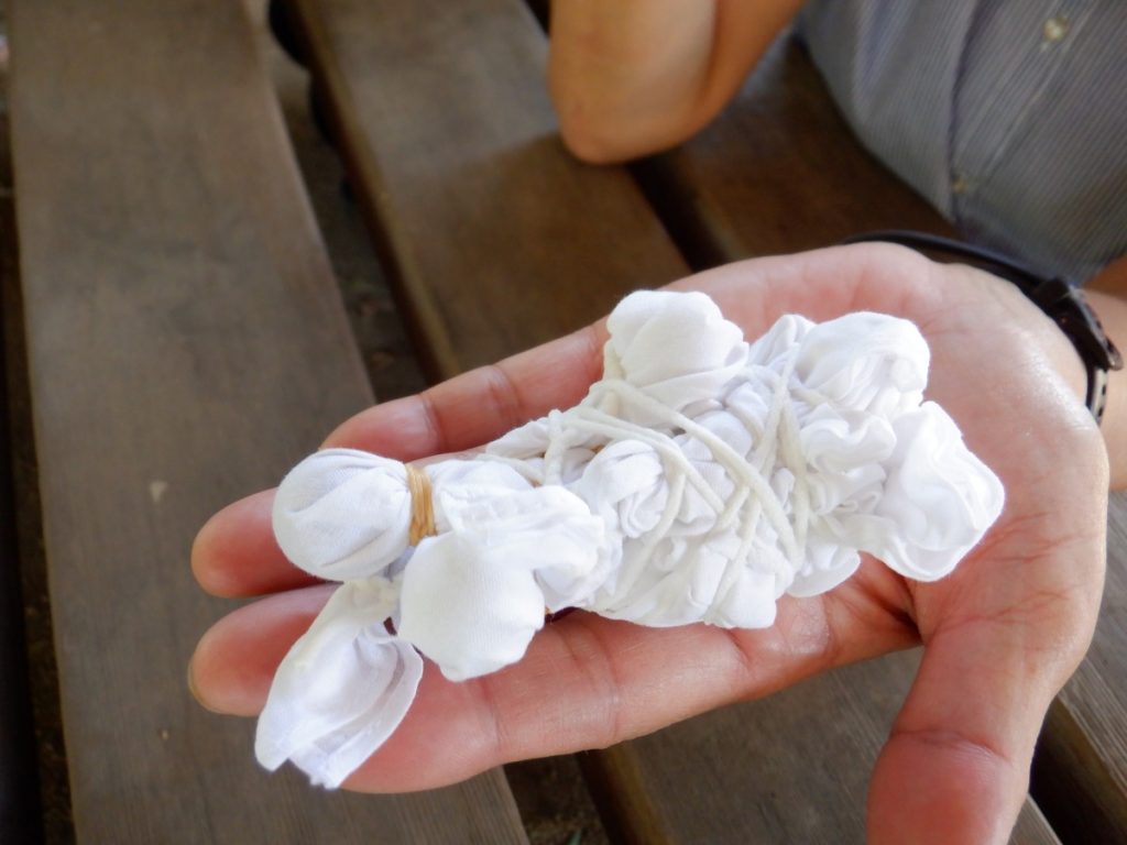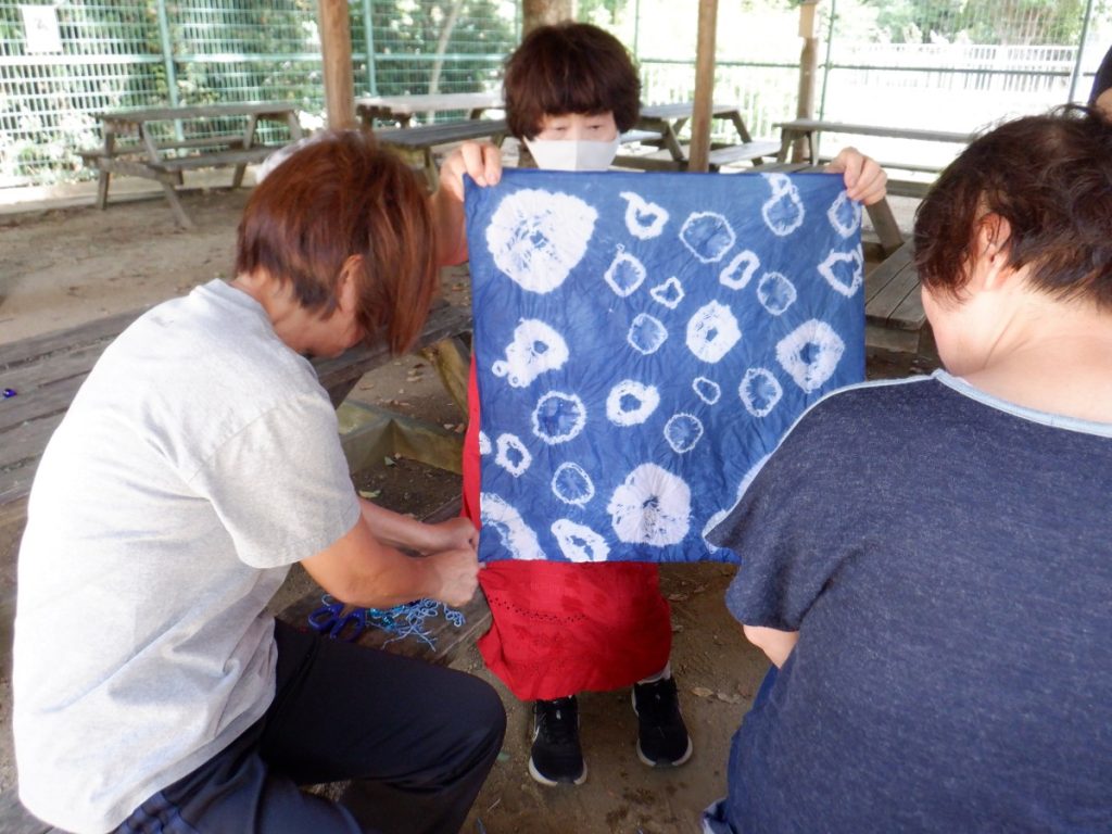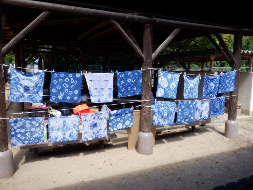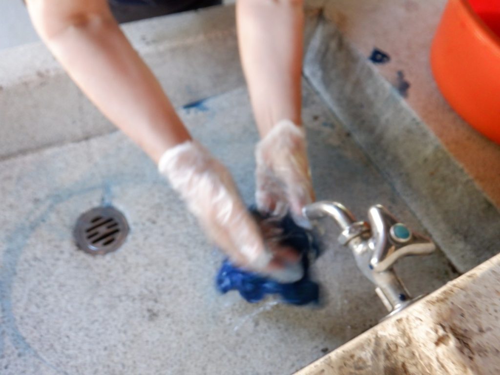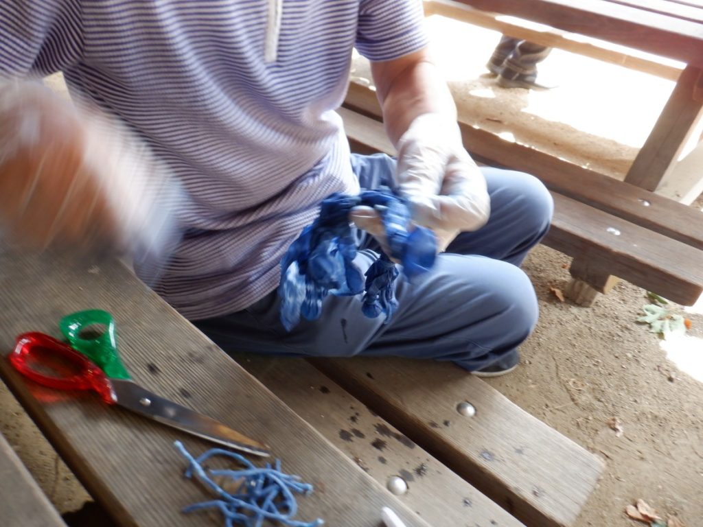 今回、どんな草木染めを使用か考えましたが、短い時間で活動ができるように今回は、生の草木を煮出す工程をしなくて済む『藍染』をみんなで行いました。
