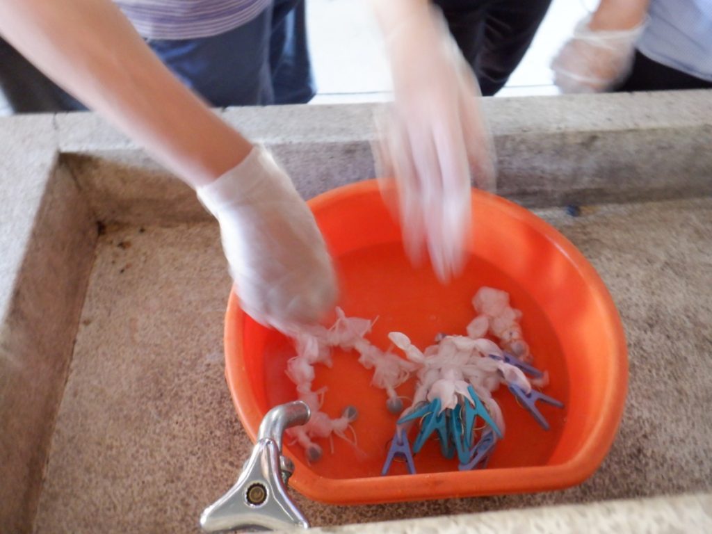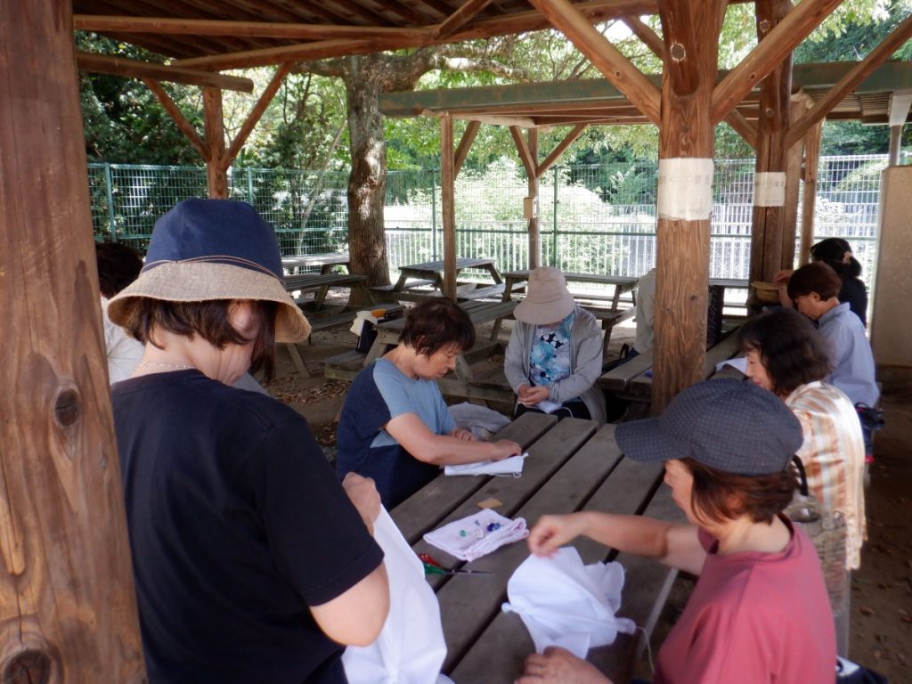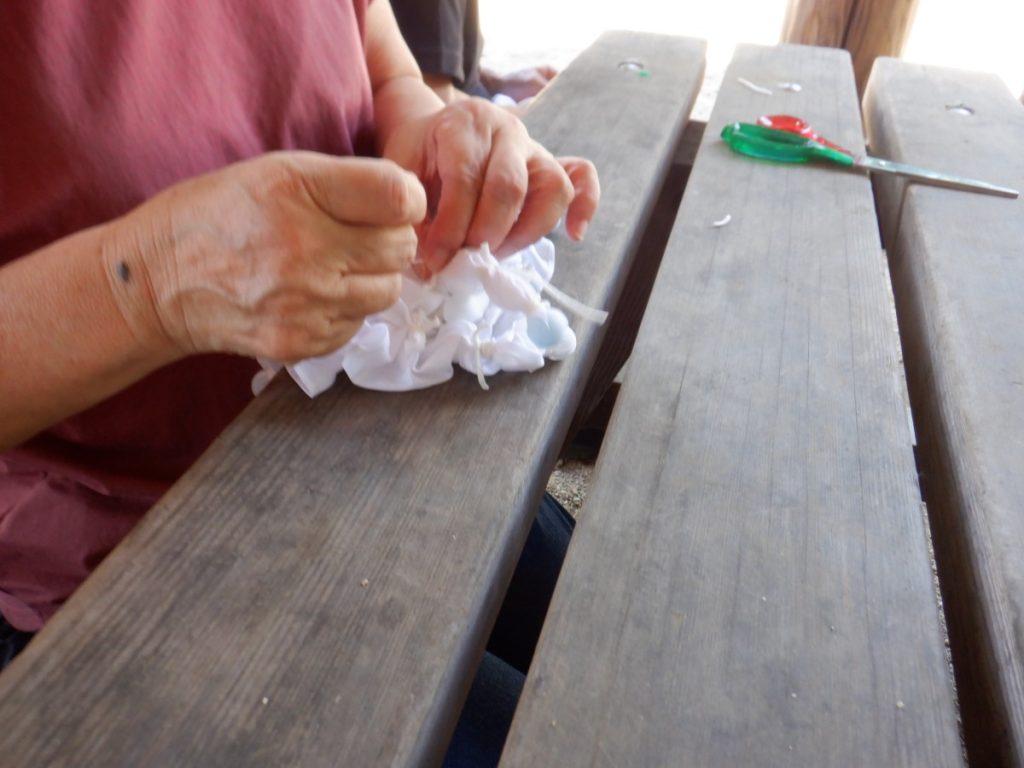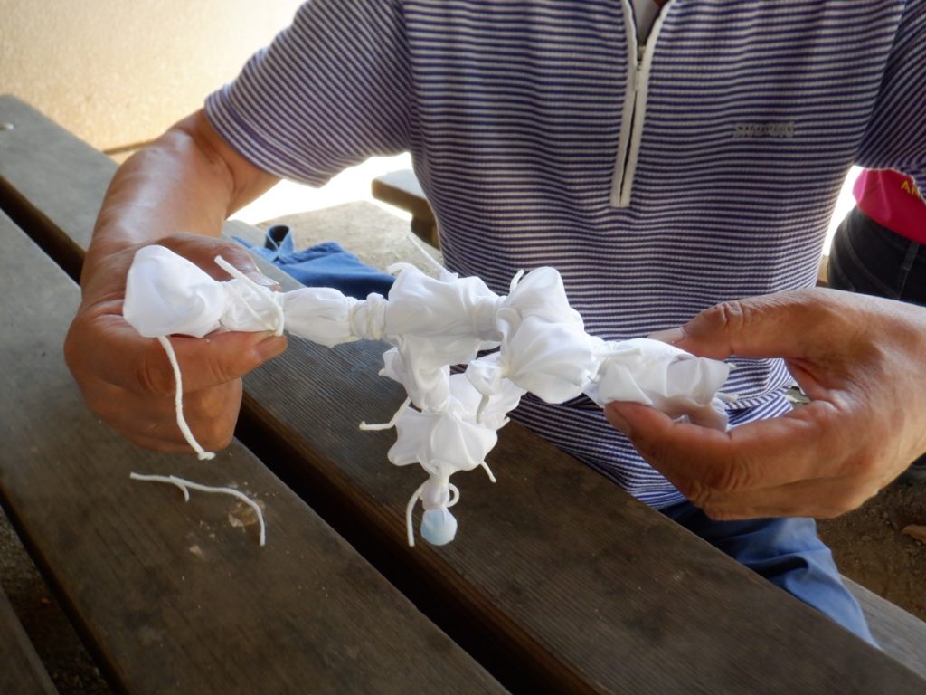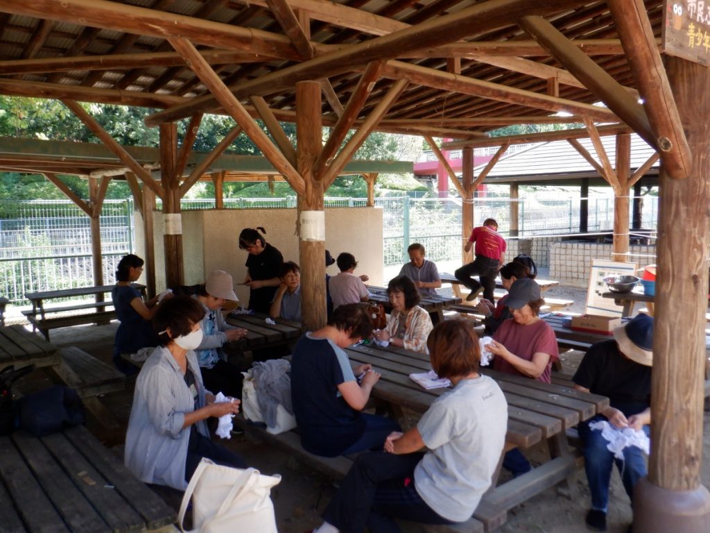 今回、どんな草木染めを使用か考えましたが、短い時間で活動ができるように今回は、生の草木を煮出す工程をしなくて済む『藍染』をみんなで行いました。