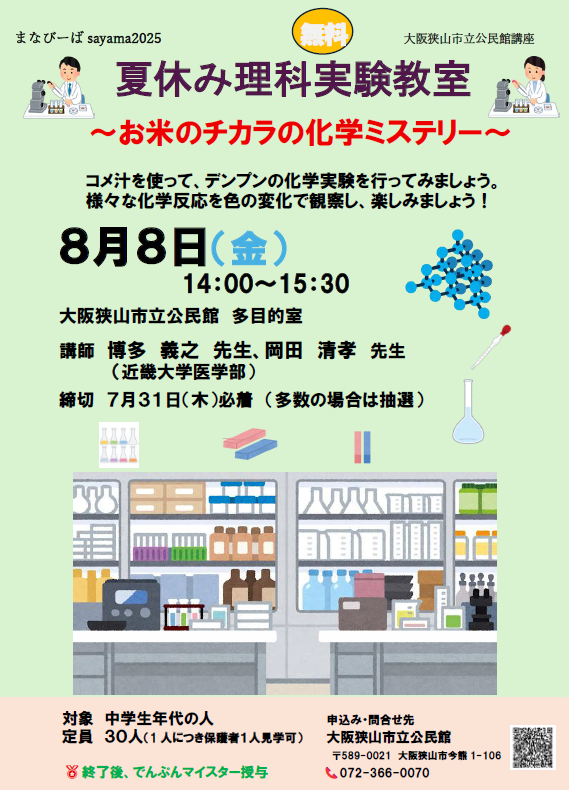 8月8日金曜日、午後2時から、公民館多目的室にて中学生年代の人を対象に、夏休み理科実験教室を開きます。コメ汁を使ってでんぷんの化学実験を行います。皆さんのご参加お待ちしてます!