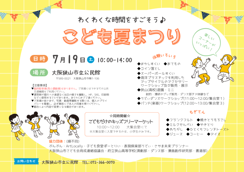 出店者募集に応募頂いたみなさんと、大阪狭山市こども会育成連絡協議会、狭山高校の生徒さんの協力のもと、『こども夏まつり』を実施します。