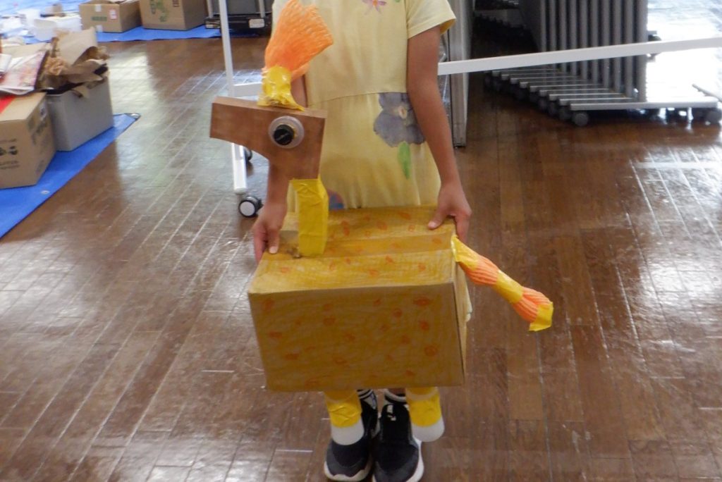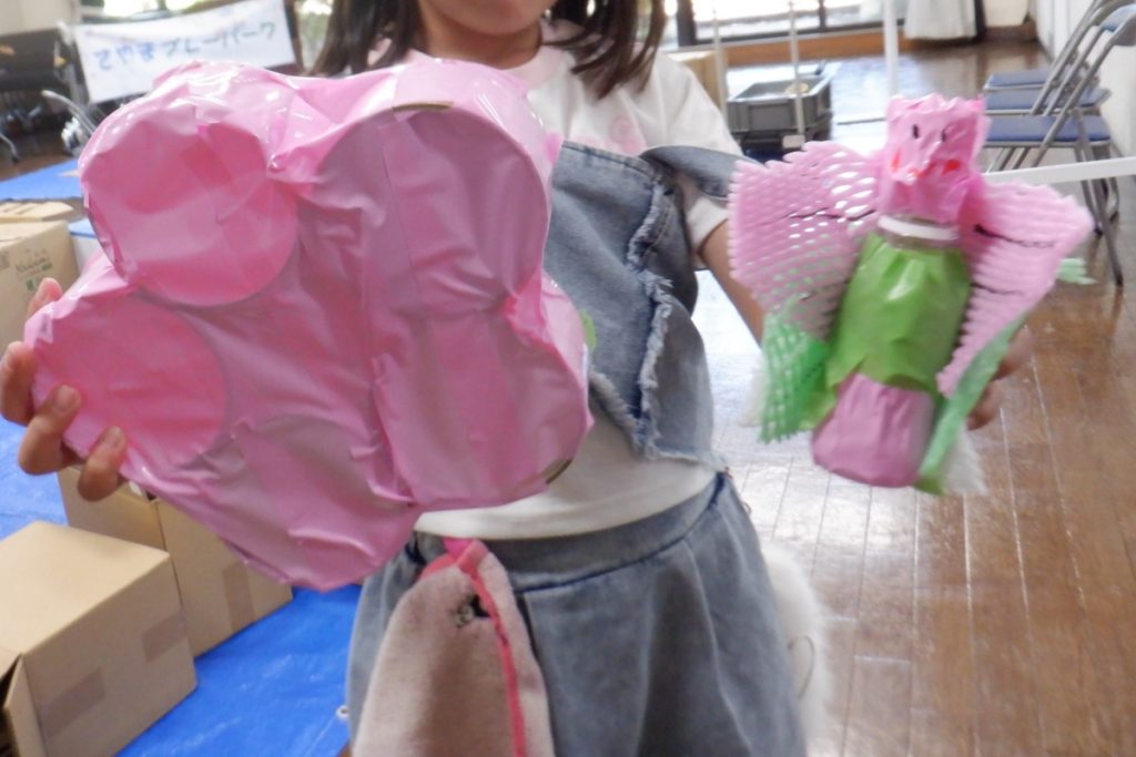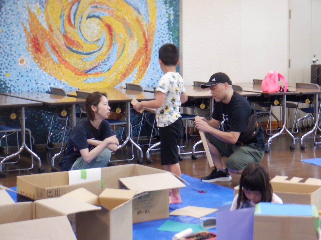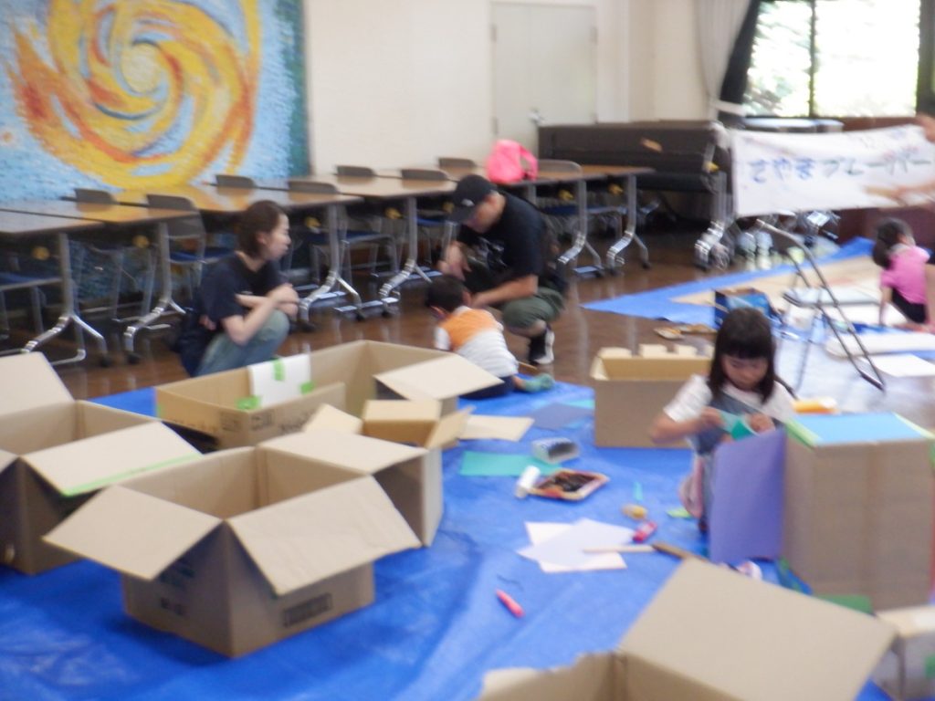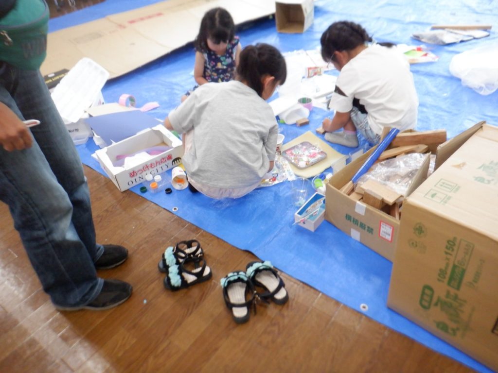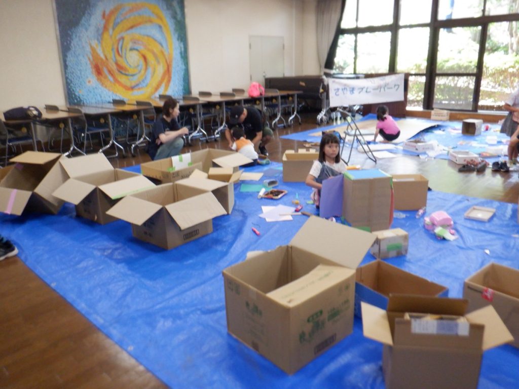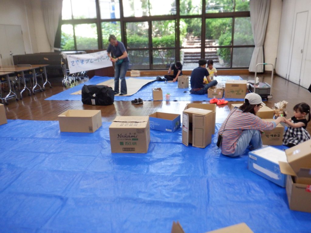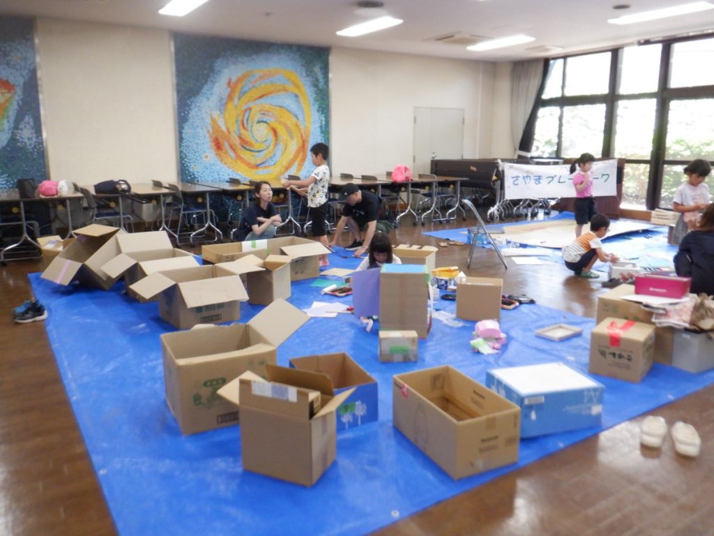 今回は、はじめてのこともあり、様子を見ながらの開催として、普段の『さやまプレーパーク』で公園に持参しているダンボールや木っ端、廃材を中心に、必要に応じて、画用紙や講座の残りのビーズなども増やして、主に、自由なモノづくりのコーナーからスタートしました。