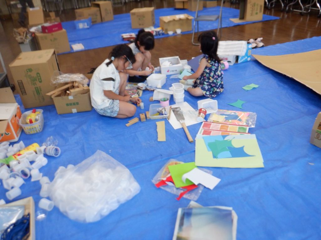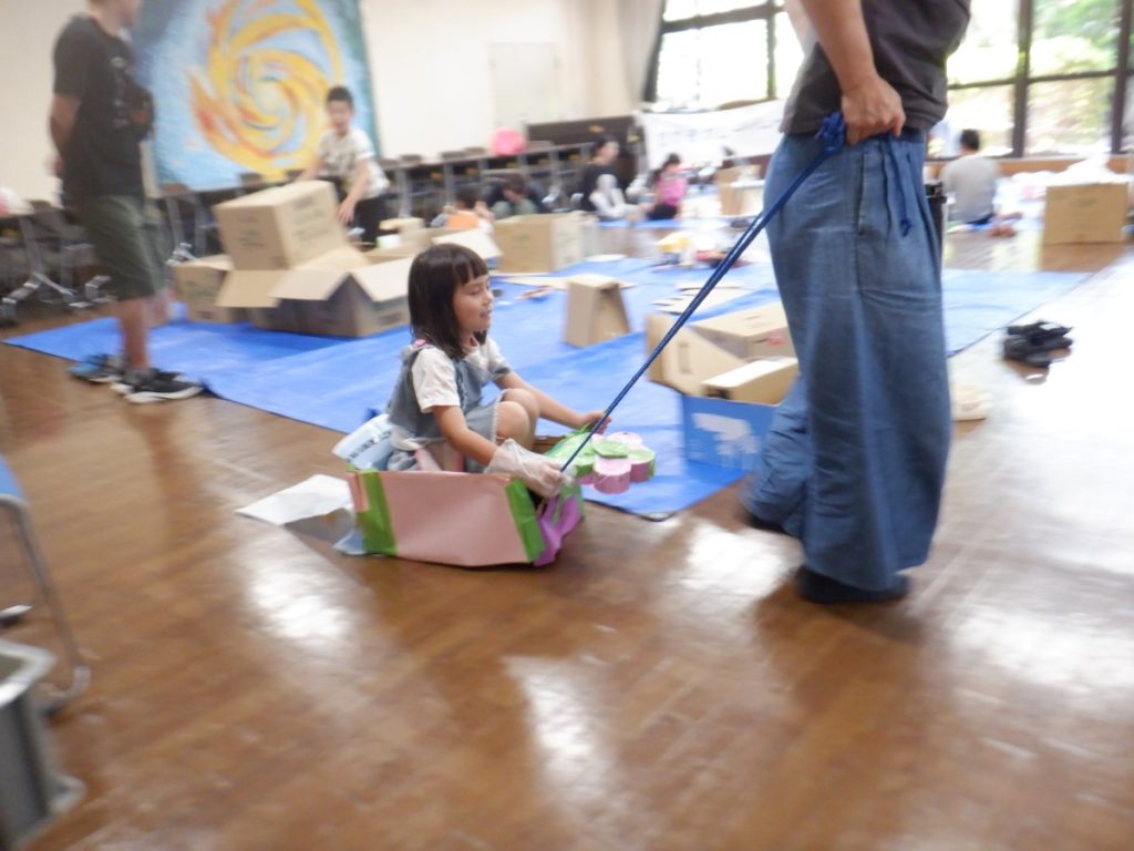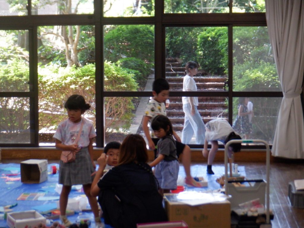 今年は梅雨明けも早く、暑すぎるので、玄関前広場での遊びを断念し、多目的室と展示フロアのパーテーションをオープンし、室内にプレーパークゾーンをつくってみました。