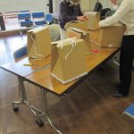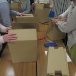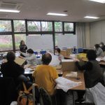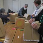 防災工作では、70Lのゴミ袋で、ポンチョと1Lペットボトル6本入りのダンボ-ル箱でスツ-ルを作りました。みなさん実際災害での状況をイメ-ジしながら、実際に現場ではどうか話しながら被ってみたり、スツ-ルに座ってみたり和気あいあいと、防災工作することができました。