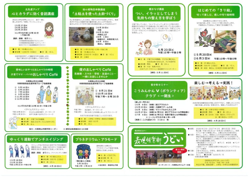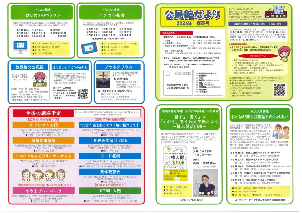 大阪狭山市2026年4月号広報に、「公民館だより」が折り込まれ、春夏講座、主に春からスタートする講座の参加者募集が始まっています。